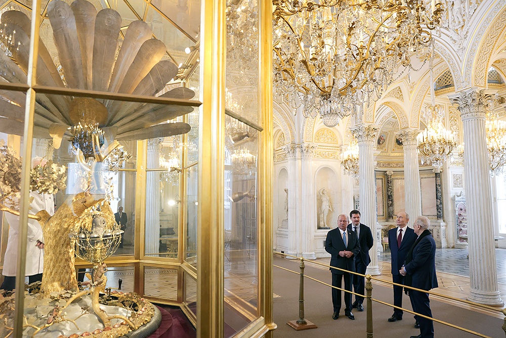 Показали султану Ибрагиму и визитную карточку главного российского музея - часы "Павлин", композицию, состоящую из фигуры птицы.