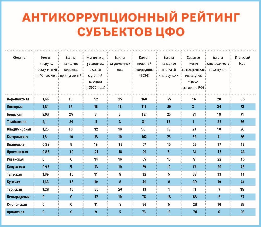 При подготовке рейтинга была проанализирована частота публикаций уполномоченными региональными ведомствами (территориальные органы МВД, СКР, Генпрокуратуры) сообщений и новостей, так или иначе связанных с антикоррупционной повесткой. По этому показателю три региона ЦФО - Костромская (162 материала, из них 128 - от прокуратуры), Воронежская (160) и Брянская (157) области сформировали тройку лидеров и по стране в целом. А в Тверской области насчитали всего 13 подобных официальных публикаций, в Ярославской - 20.