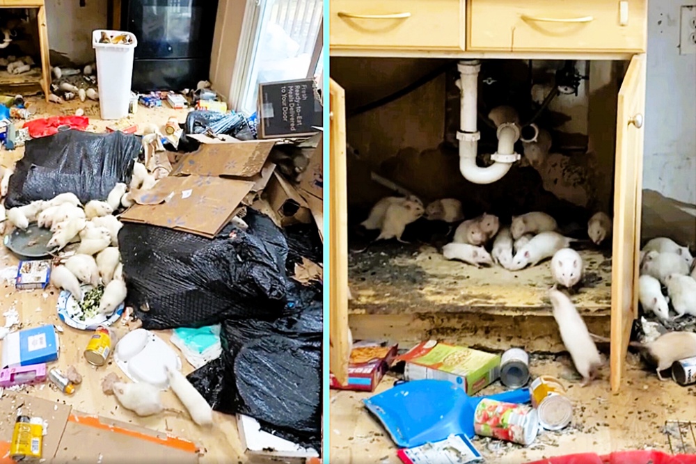 Внутри находилось почти 300 белых крыс, которые бегали по комнатам и прятались в шкафах. В стенах они прогрызли дыры.