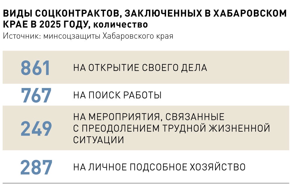 Еще один вид государственной помощи, пользующийся спросом у жителей Хабаровского края, - социальные контракты. Всего за 2025 год заключено 2164 договора, из них 64 - с участниками СВО и 427 - с многодетными семьями. Соцконтракт отличается от пособий, его цель - помочь семьям справиться с трудными обстоятельствами и начать свое дело. Полученную от государства сумму возвращать не требуется, однако необходимо отчитаться, как использованы средства.