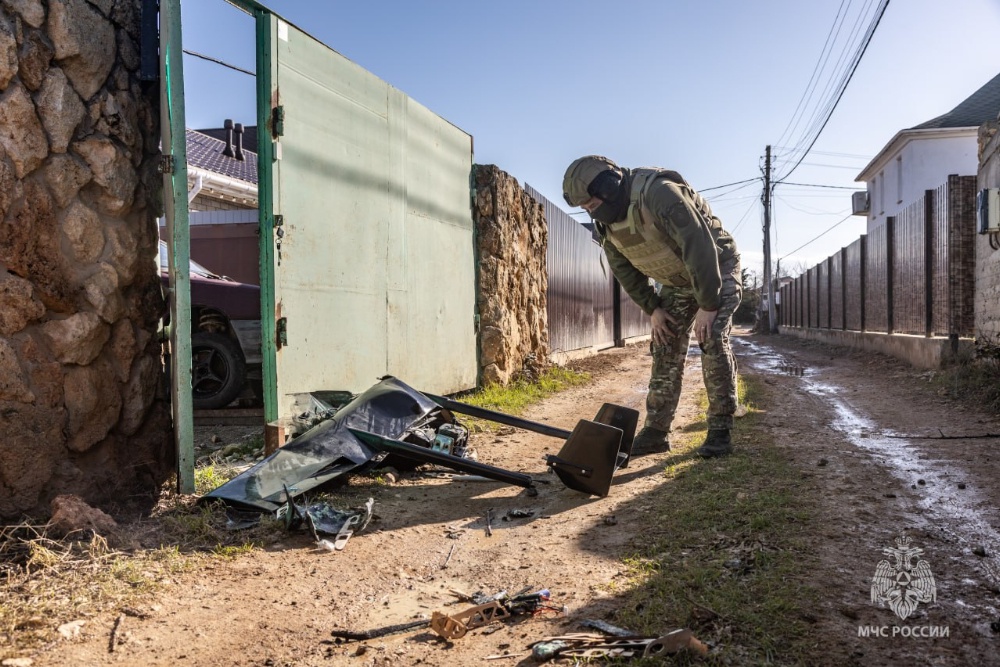 Один из сбитых беспилотников упал в частном секторе в районе мыса Фиолент. Он был обезврежен сотрудниками МЧС и Росгвардии.