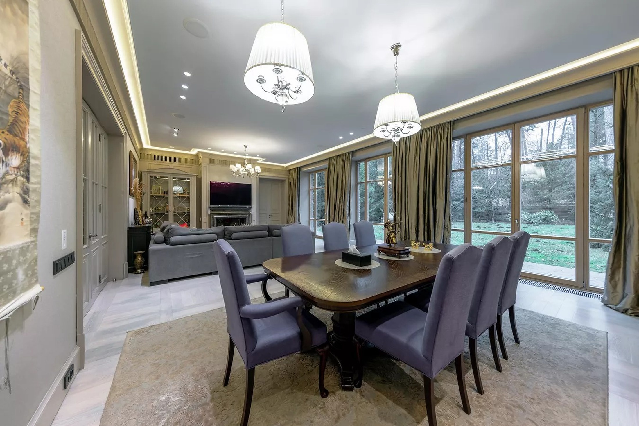 Судя по объявлению, внутри элитной резиденции на Рублево-Успенском шоссе - три спальни, три санузла, кабинет, кинотеатр, винная комната и гараж на два автомобиля. На участке площадью 15 соток стоит двухуровневый гостевой домик с баней и беседкой-барбекю.