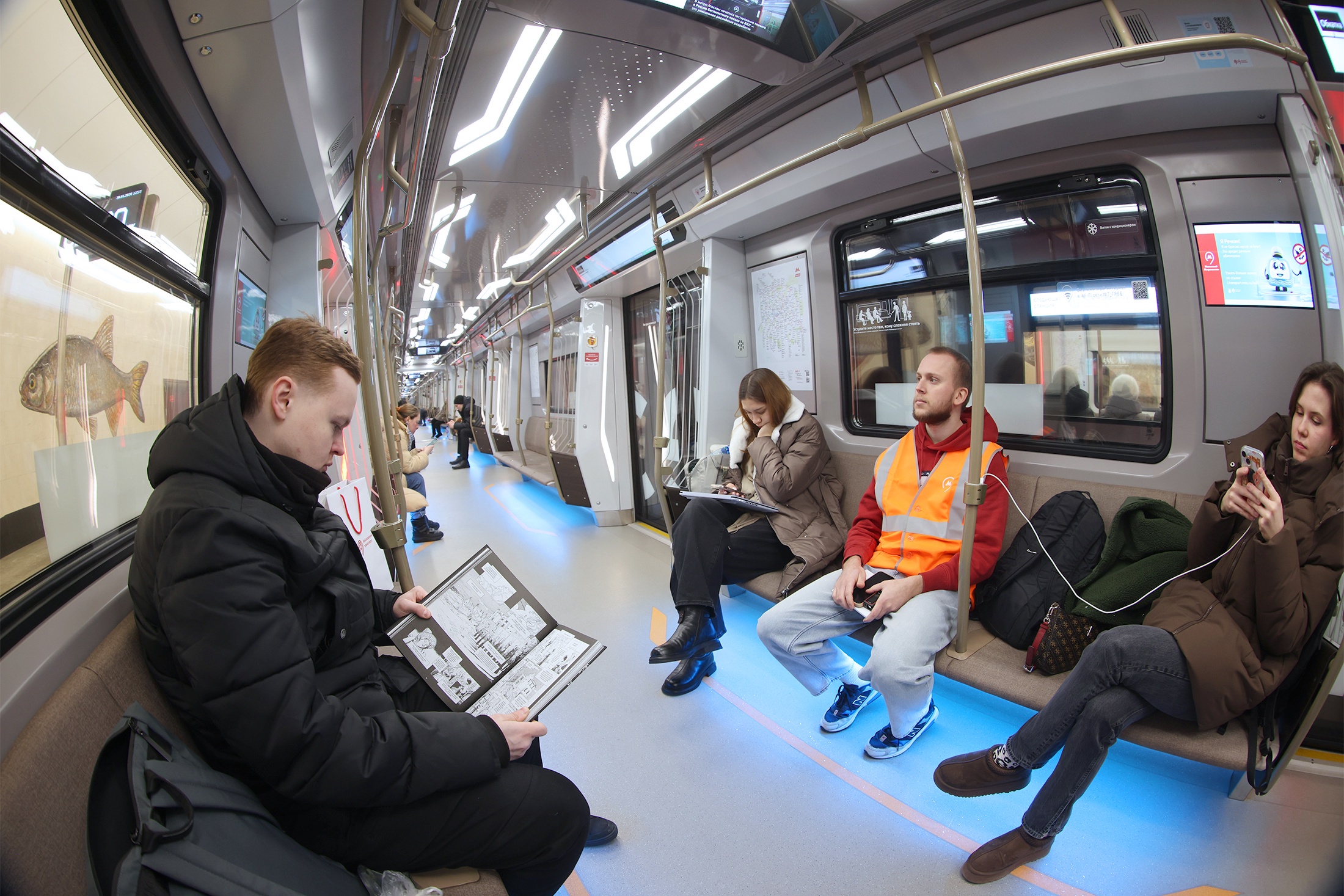 Внутри поезд - точная копия тех, что уже курсируют по БКЛ. Пассажиры давно оценили широкие двери, разноцветную подсветку под сиденьями, зарядки для гаджетов и удобные сиденья в составах Москва‑2024. Кабина машиниста тоже практически не изменилась. Единственное новшество - дополнительная кнопка, запускающая автопилот.