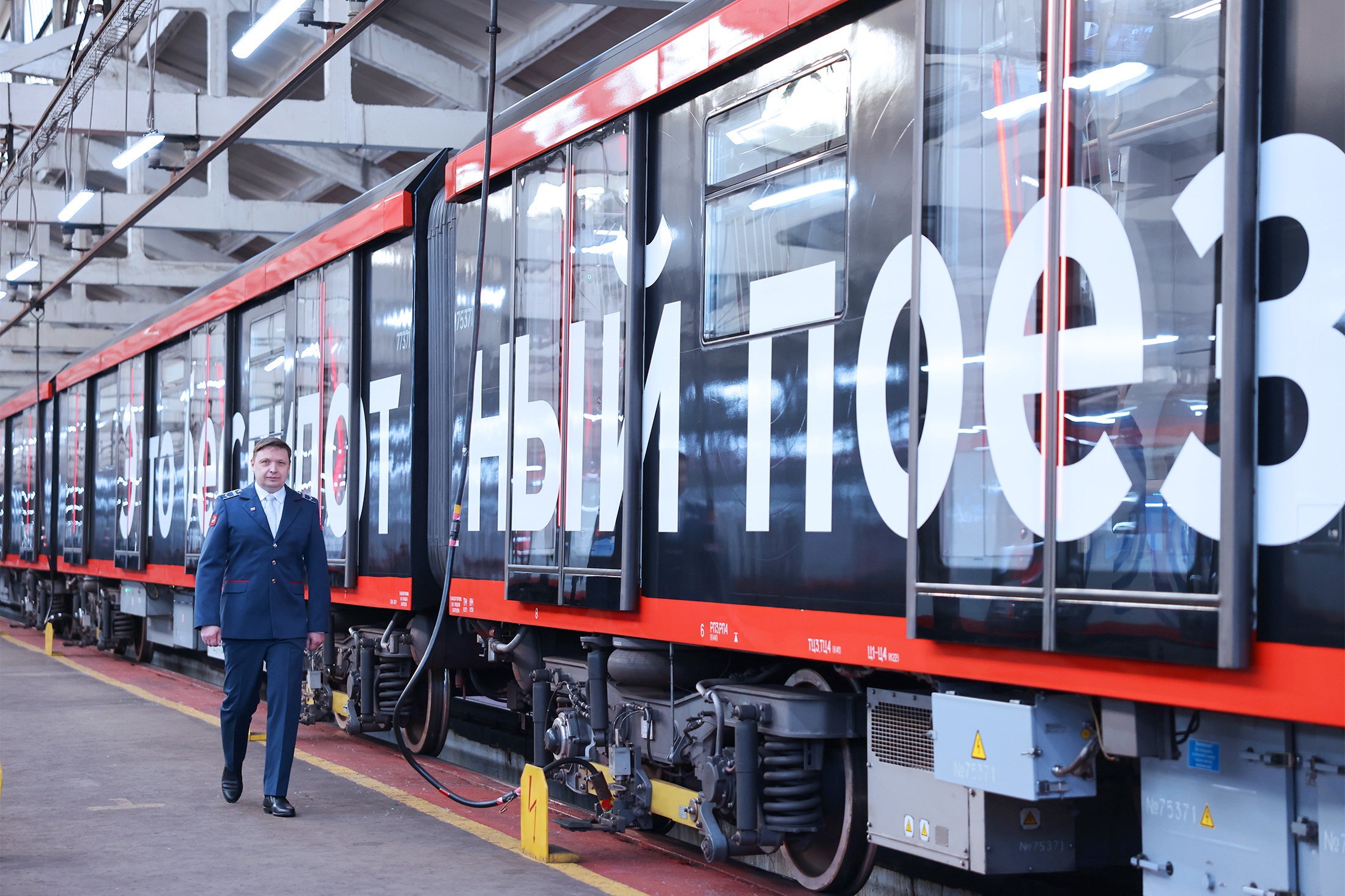 В ангаре электродепо сразу бросается в глаза новенький, блестящий состав: черный, с двумя яркими красными линиями вдоль всего корпуса. "Это беспилотный поезд", - крупно написано на вагонах. А сверху на лобовом стекле - табличка с лаконичным словом "обкатка". Все ясно: поезд пока в тестовом режиме.