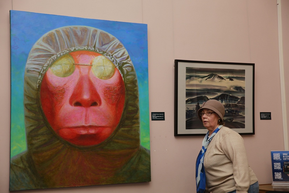 Одна из центральных работ - портрет мужчины в специальных очках от сверкающего на солнце снега. Картину подарили галерее после прошедшей несколько лет назад выставки художников Республики Саха (Якутия). Ее автор Михаил Старостин - один из самых известных современных художников самого холодного региона России. Как сообщила куратор выставки, по переписи 2021 года в стране на тот момент проживало 478 409 человек.