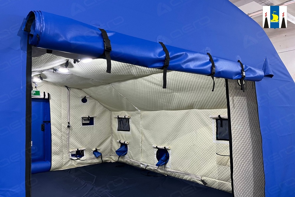 На учениях впервые было развернуто новое укрытие для людей, эвакуированных при угрозе цунами. Убежище представляет из себя пневмокаркасный модуль - быстровозводимое надувное сооружение с герметичным каркасом из высокопрочного армированного ПВХ-полотна.