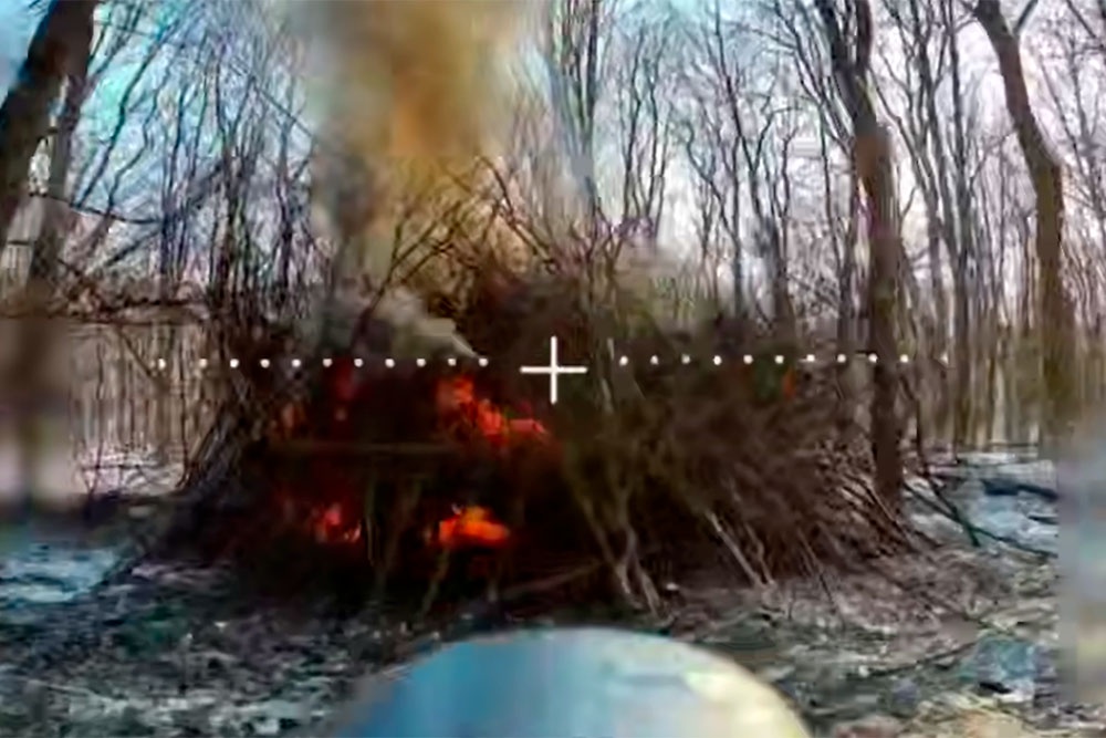 Боевая машина находилась в лесном массиве. Экипаж попытался спрятать ее, забросав ветвями и срубленными деревцами. Наши операторы дронов провели несколько атак с разных направлений, после чего "семьдесят второй" ярко запылал.