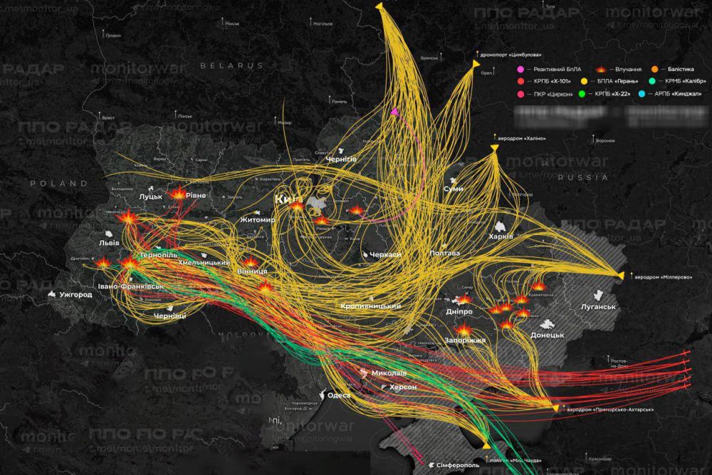 По данным ПВО противника, в воздушной атаке участвовали более 200 БПЛА разных типов, до 20 крылатых авиационных ракет, десяток "Калибров" и как минимум один гиперзвуковой "Циркон".