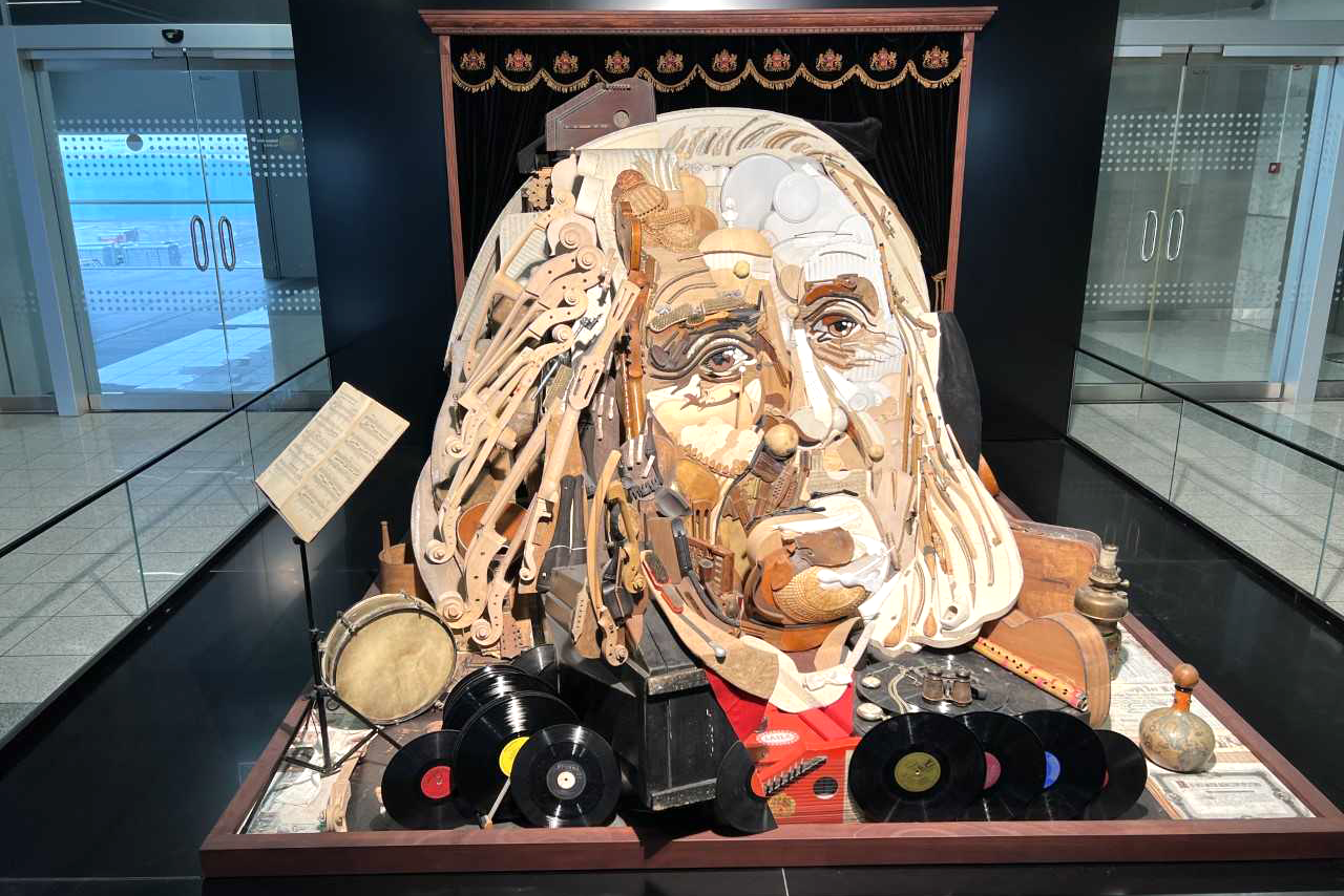 А вот автора трехмерной инсталляции в память о выдающемся композиторе, что развернута тут же, у выходов на посадку, назвать необходимо. Это чешский художник Патрик Прошко.