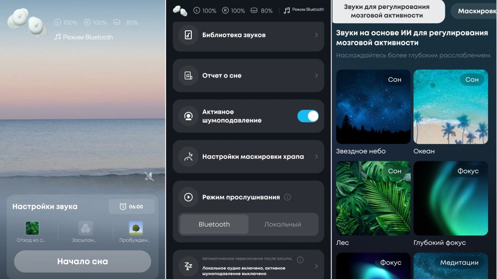 - Управление: тач-панели + приложение Soundcore (библиотека звуков для сна, мониторинг сна, будильник);