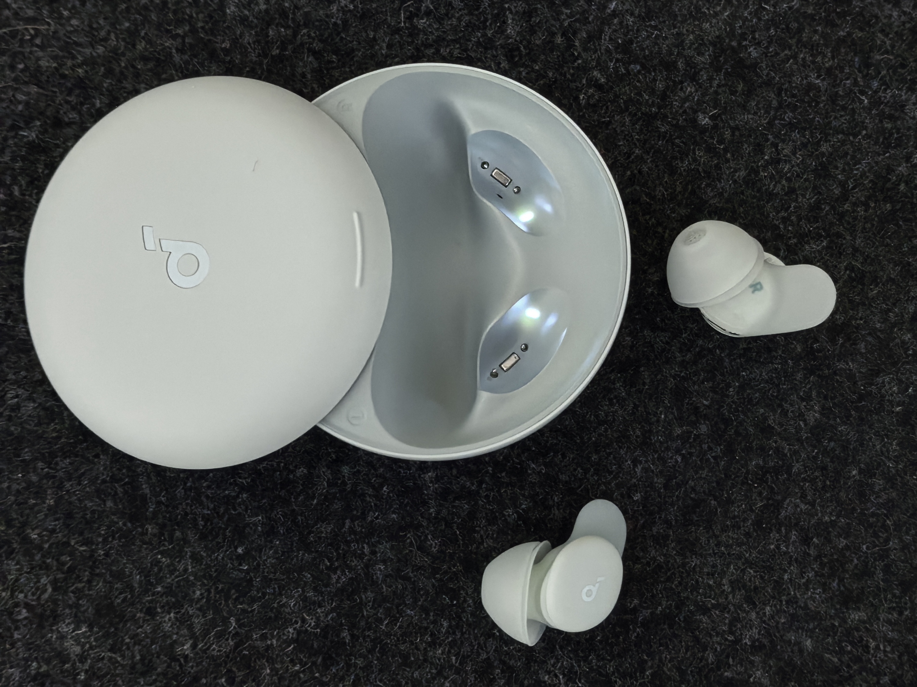 Кейс наушников тут - не просто "аккумулятор". Он выполнен в форме "гальки" со сдвижной крышкой и подсветкой слотов - удобно, когда приходится надевать или снимать наушники в темноте.