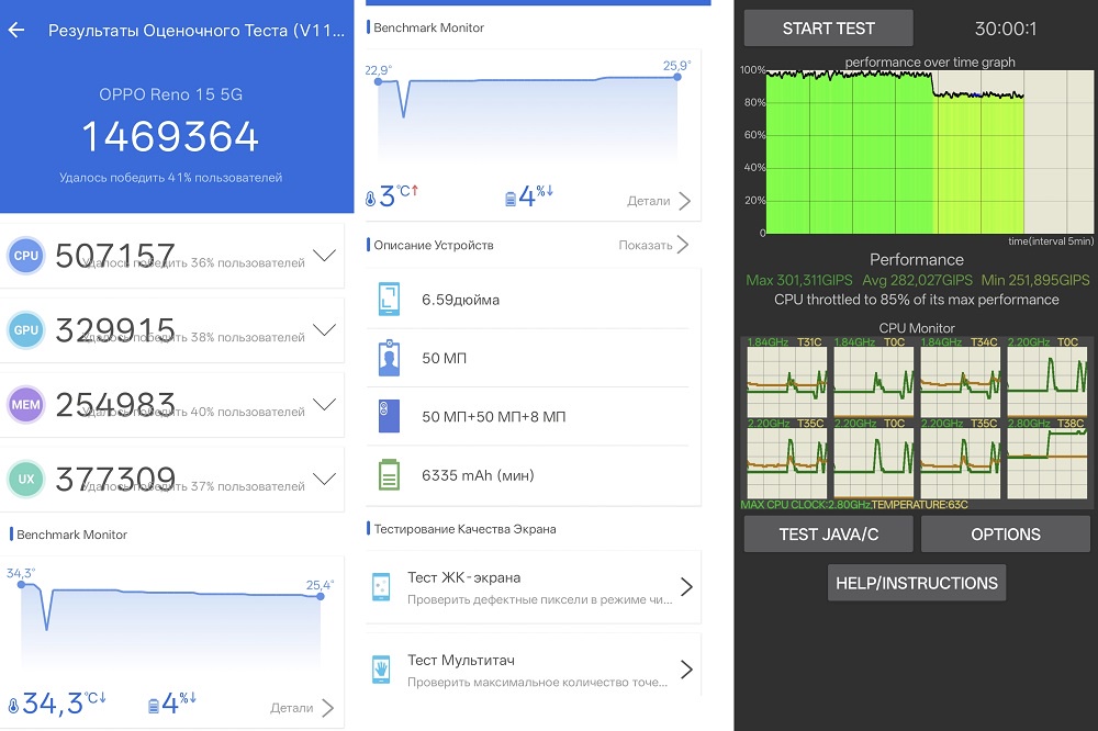 В бенчмарке AnTuTu V11 Reno15 набрал 1.47 млн баллов. Неплохо для не игрового смартфона. Что касается троттлинга, то есть, принудительного замедления работы процессоры при большой длительной нагрузке во избежание перегрева, то тут тоже все ок - 85% от полной мощности после 30 минут в CPU Throttling Test. Это очень хороший показатель.