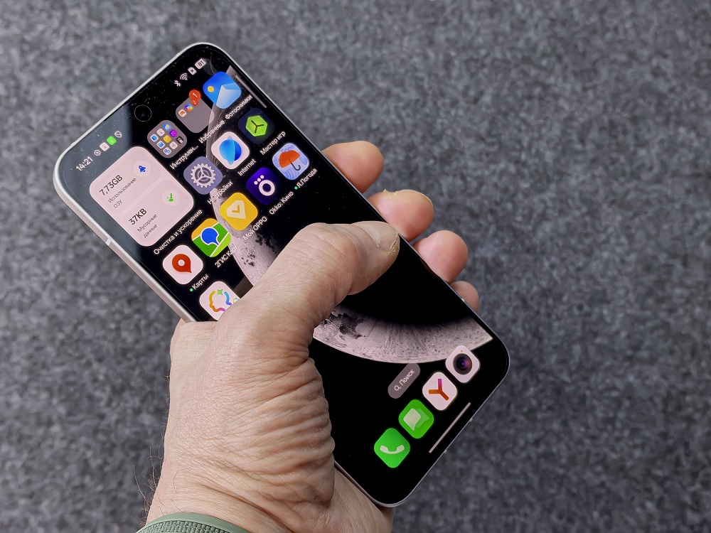 Reno15 c одной стороны, выглядит очень нарядно, особенно версия "Сияющий белый" (которая и была у нас на обзоре) с мерцающим переливом, напоминающим Северное сияние. При этом у него чуть меньшая, чем сейчас принято, диагональ - 6,59, а не 6,8 дюйма. Не компакт-смартфон, но и не планшет, который надо укрощать двумя руками. Корпус тонкий, телефон (воспользуемся классическим штампом) комфортно лежит в ладони и главное - им реально пользоваться одной рукой: ответить на сообщение на ходу, пролистать карту, переключить музыку. Это та самая эргономика, о которой многие бренды забыли в погоне за "еще одной десятой дюйма".