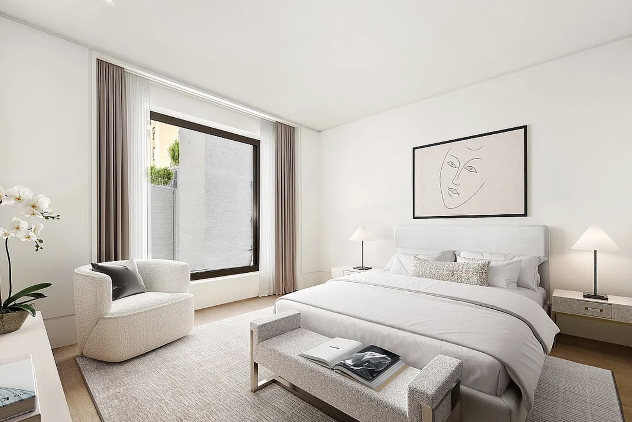 Полы выполнены из американского белого дуба, потолки высотой свыше трех метров усиливают ощущение пространства, а панорамные окна открывают эффектный вид на нью-йоркский skyline. Кухня оборудована рабочими поверхностями из полированного камня и техникой премиум-класса.