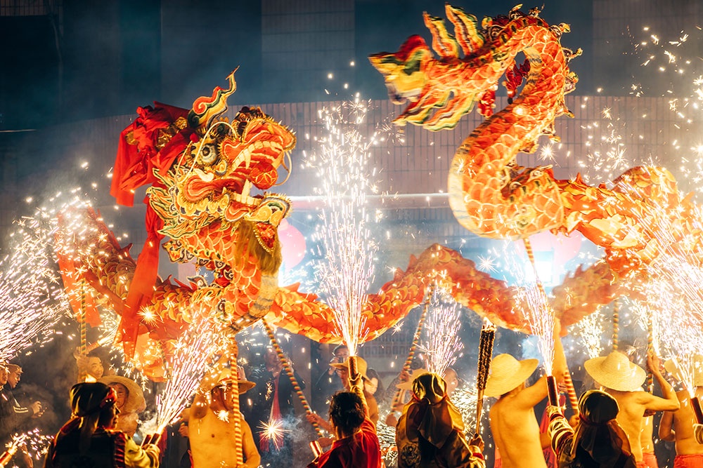 В канун Нового года по лунному календарю наступает самый душевный, торжественный и важный вечер в году, когда вся семья собирается за праздничным ужином. Неторопливые беседы о повседневных делах в этой атмосфере приобретают особую теплоту и смысл. Одним из самых трогательных моментов становится традиция дарения красных конвертов с деньгами (ясуйцянь). Согласно древнему поверью, этот дар должен защитить детей от злых сил и обеспечить им благополучие в наступающем году. Также совершаются подношения предкам - дань уважения и светлая память о тех, кого нет рядом. От рыбы, олицетворяющей пожелание "избытка из года в год" (няньняньююй), до пельменей, символизирующих прощание со старым и встречу нового, - каждое блюдо наполнено добрыми пожеланиями. Помимо этого, на столе часто можно увидеть новогодний пирог няньгао, чье название созвучно пожеланию "повышения благосостояния из года в год". Все эти обычаи создают неповторимую атмосферу праздника, которая является, прежде всего, атмосферой семейной любви и тепла.