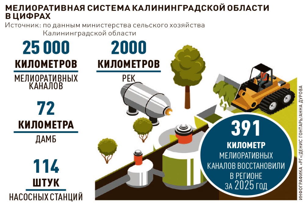 Теперь вопросами осушения занимаются сразу две организации: областная "Калининградмелиорация" и федеральное учреждение "Управление "Калининградмелиоводхоз". За 2025-й они восстановили 182 и 70 километров мелиоративных каналов соответственно.