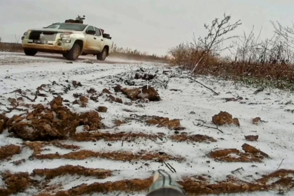 Его водитель, по всей видимости, выжимал максимально возможную на такой трассе скорость. Машина петляла, ее постоянно заносило, и в один из моментов вэсэушник все-таки не справился с управлением, пикап развернуло, и он заглох. Беспилотник врезался в него и взорвался.
