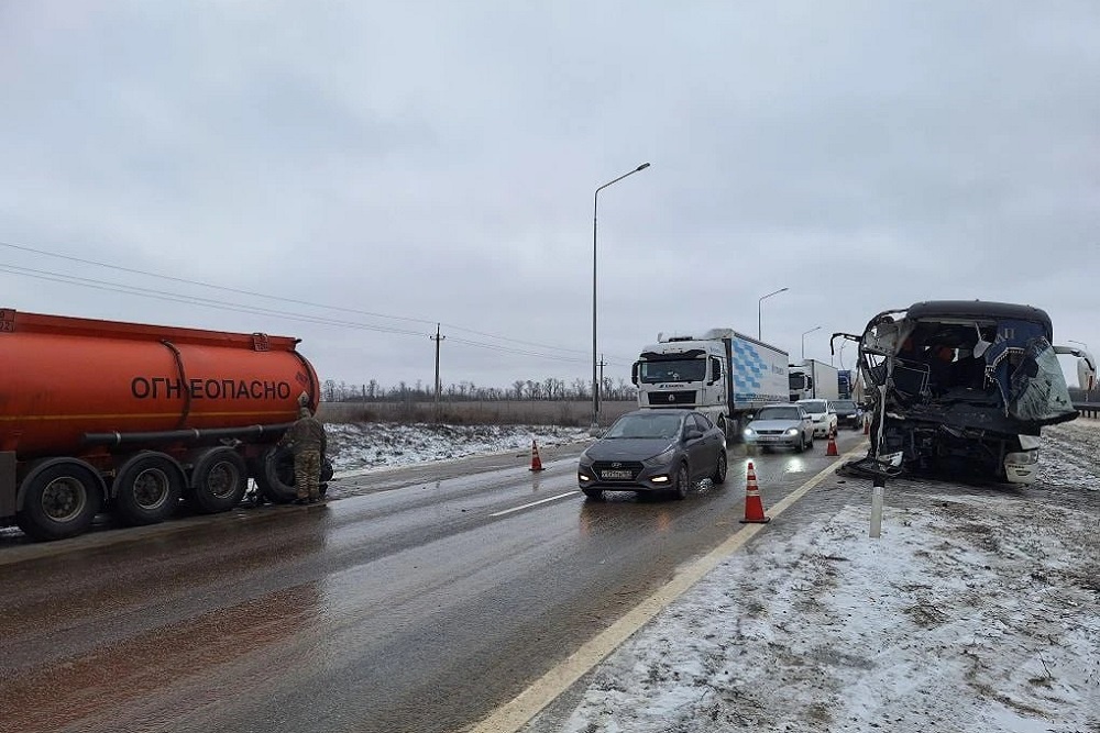 По данным ГАИ Ростовской области, ДТП произошло сегодня в 7:50 на 867-м километре федеральной дороги. Автобус Yutong под управлением водителя 1987 года рождения двигался по маршруту "Москва - Стаханов". В салоне находились 18 пассажиров. По предварительным данным, водитель автобуса не выбрал безопасную дистанцию до впереди едущего автомобиля (грузовик Scania с полуприцепом-цистерной).
