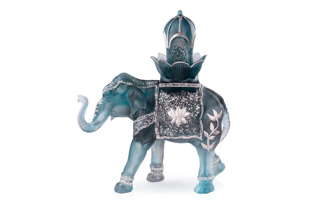 Скульптура слона относится к другой коллекции - индийской. Величественный силуэт в глубоких сине-серых оттенках подчеркнут отделкой из палладиевой фольги, цветочные орнаменты отсылают к убранству дворцов махараджей.