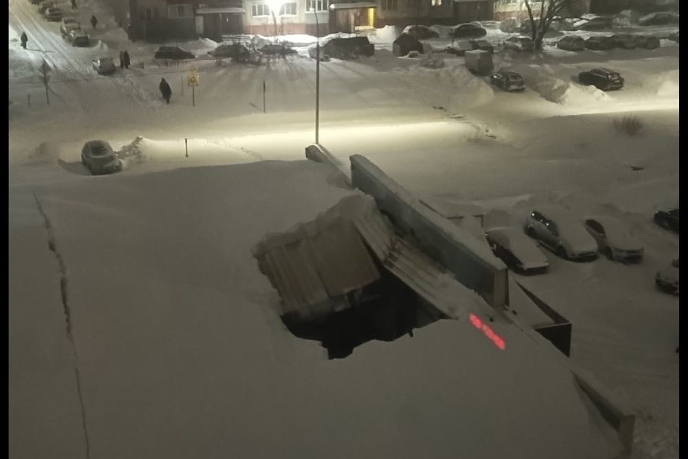 Тяжести снега не выдержала часть крыши одного из сетевых магазинов. Судя по опубликованным фотографиям, крыша сложилась внутрь здания. В результате происшествия никто не пострадал.