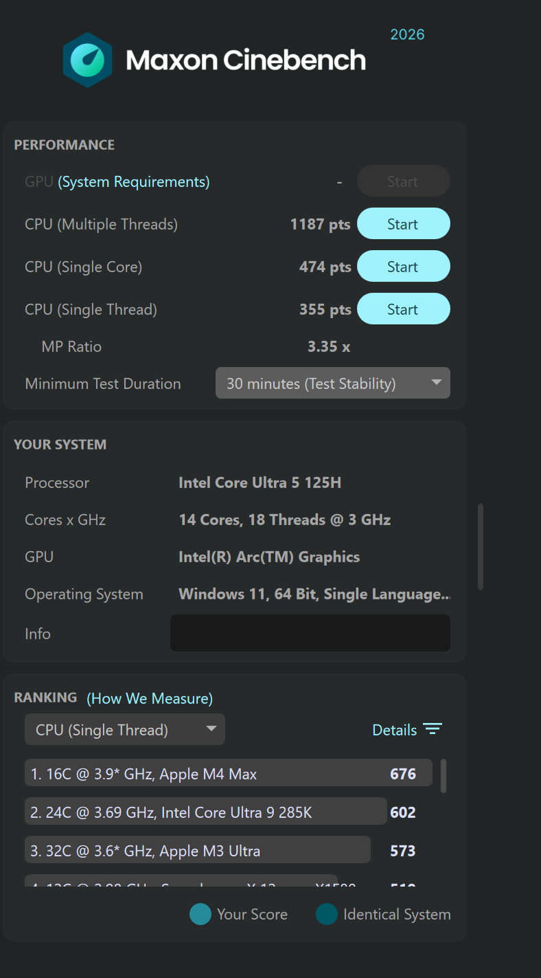 - Cinebench CPU (Single Thread): 355 pts