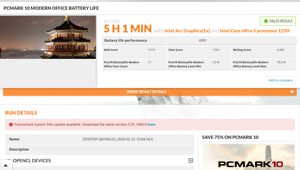 Комплексный бенчмарк PCMark 10 Extended зафиксировал 5701 балл - показатель умеренный для Extended-версии теста, которая включает сложную графическую нагрузку, не характерную для офисного сценария. Этот тест ближе к представлению "что будет в реальной работе". Результат уверенный: ноутбук заточен именно под офисные сценарии, документооборот, веб‑работу, видеосвязь, типичную нагрузку малого бизнеса и командировок.