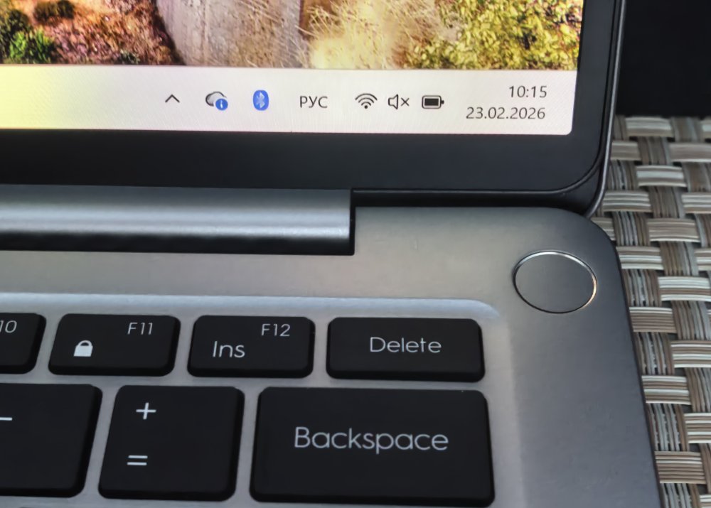 Клавиатура полноразмерная, без цифрового блока, с четырьмя уровнями белой подсветки (подсветка равномерная). Ход клавиш средний, звук тихий, момент срабатывания четкий. Кнопка питания вынесена за пределы основного клавишного блока и совмещена со сканером отпечатков пальцев - срабатывает быстро и надежно. Тачпад небольшой, с достаточно скользким покрытием, но физический клик возможен только в нижних углах панели. Нижняя грань корпуса оснащена широкой вентиляционной решеткой и резиновыми ножками, которые приподнимают устройство над столом для улучшения воздухообмена.