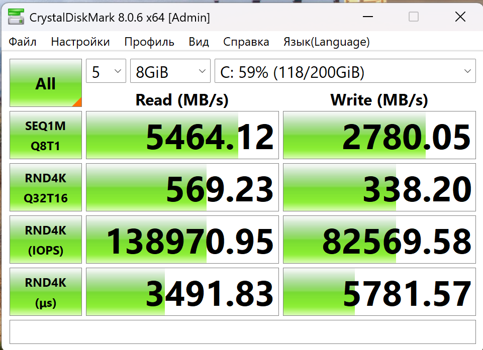 Накопитель объемом 512 ГБ на интерфейсе PCIe 4.0 x4 показывает в CrystalDiskMark очень достойные результаты: быстрое последовательное чтение - 5464 МБ/с и нормальная запись - 2780 МБ/с. Быстрый запуск системы, копирование больших архивов, открытие проектов - всё это происходит без раздражающих пауз. Скорость записи ниже чтения, но по меркам массовых PCIe 4.0 SSD это нормально и практически не ограничивает сценарии, кроме специфичных задач с постоянной записью больших массивов (например, регулярный монтаж в 4K с кешированием на диск).