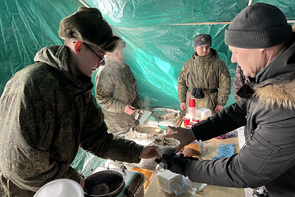 Большую палатку-шатер развернули сотрудники МЧС. А в ней заняли позицию молодые улыбчивые повара из воинской части неподалеку - в полной боевой готовности угощать всех участников гречневой кашей с тушенкой и горячим чаем.