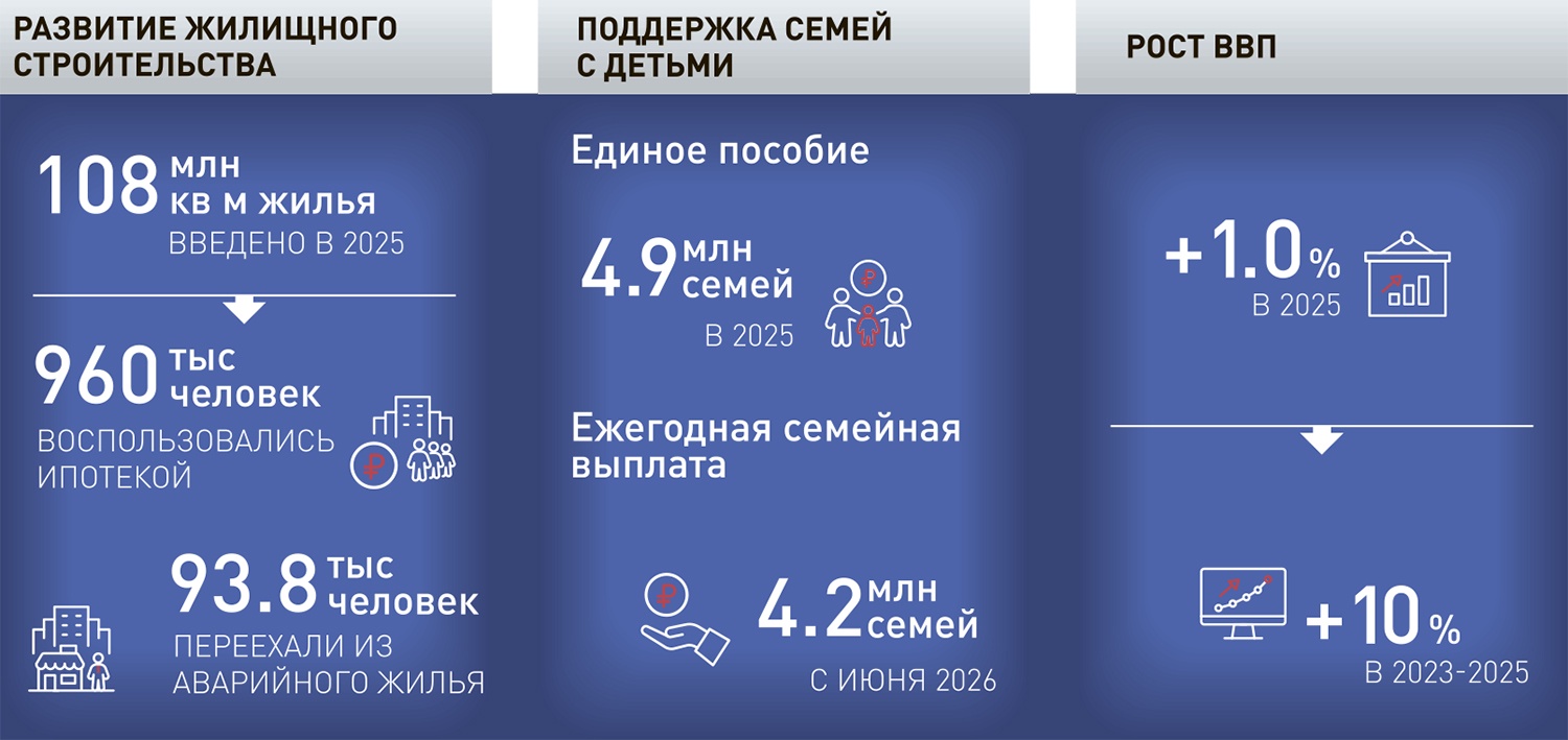 На особом контроле у правительства все, что связано с достатком старшего поколения. По поручению президента в два этапа были повышены страховые пенсии исходя из инфляции в 9,5 процента, и возобновлена их индексация для работающих граждан. Комфортная жизнь любого человека невозможна без соответствующей социальной инфраструктуры. Для большинства семей самый насущный вопрос - это жилье. Его строительство по всей стране продолжается. "В прошлом году было возведено 108 миллионов новых квадратных метров, - заявил Мишустин. - Чтобы улучшить условия проживания, люди привлекают кредитные средства, чем только за год воспользовалось свыше 960 тысяч граждан".