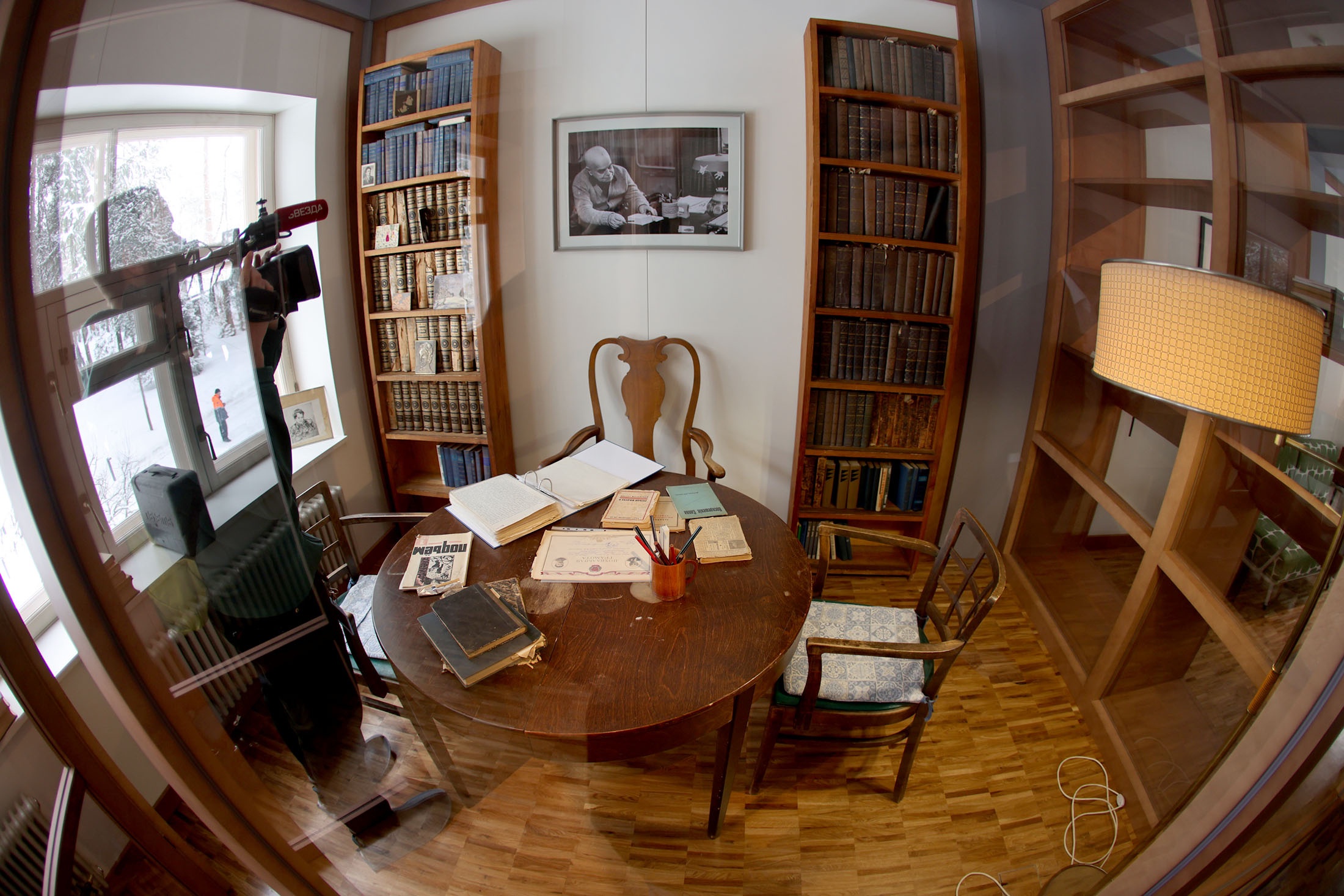 Кабинет писателя расположился на полукруглой террасе дома. Такие террасы - с окнами, где много света, - фирменный элемент старейших построек Переделкина, их сохранилось немного. Но такой же - в здешнем доме Пастернака. В воссозданном кабинете Шкловского на окнах висят листы - таков был метод его работы с текстом. Его проза мозаична, зачастую автор перепрыгивает с одной темы на другую. Развешивание листов с текстами помогало ему "монтировать" текст. Любопытно, что так он поступал не только со своими произведениями, но иногда и с чужими книгами. Горький вспоминал: дал Шкловскому книгу из своей библиотеки, а тот вернул ему разрозненные листы. Горький был этим возмущен и больше Шкловского не подпускал к своей библиотеке.