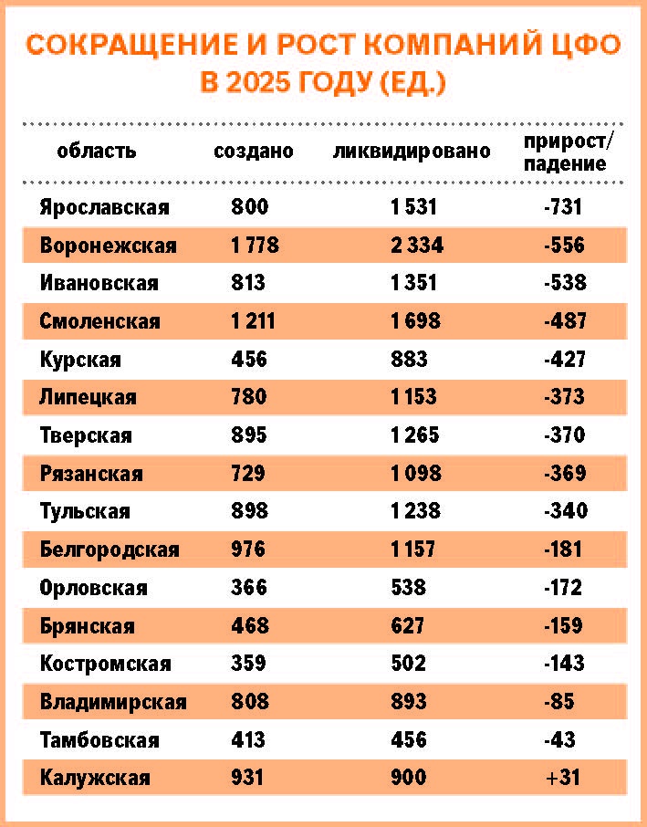 В ЦФО больше всего предприятий в 2025-м появилось в Воронежской (1778), Смоленской (1211) и Белгородской (976) областях. Закрылось - в Воронежской (2234), Смоленской (1698) и Ярославской (1531). В последнем регионе самая высокая убыль компаний - их стало меньше на 731. Единственный в Центральном округе регион с положительным балансом - Калужская область - приросла 31 коммерческим предприятием.