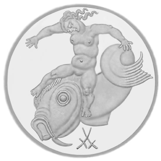 Похоже, у отважных китобоев имелось особое представление о богине судьбы - нагая деваха лихо балансирует на спине морского гиганта, который, судя по закрученному хвосту, закладывает крутые виражи, чтобы сбросить отчаянную наездницу.