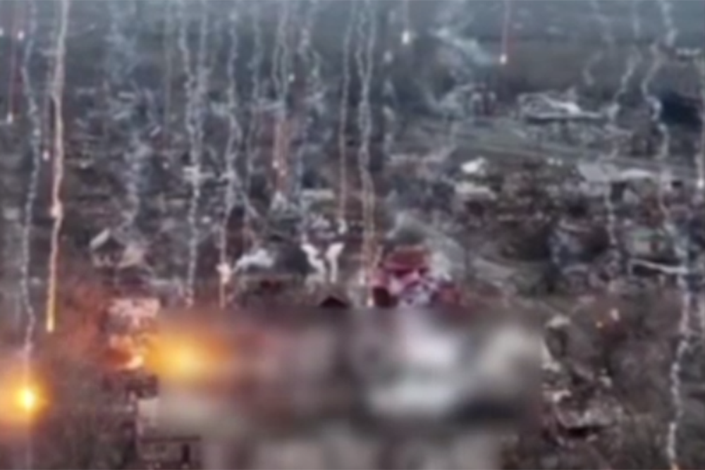 Дрон снял, как город, подобно метеоритному дождю, накрывает залп термитных (магниевых) снарядов. Вероятно, это 9М22С, входящие в арсенал РСЗО "Град".