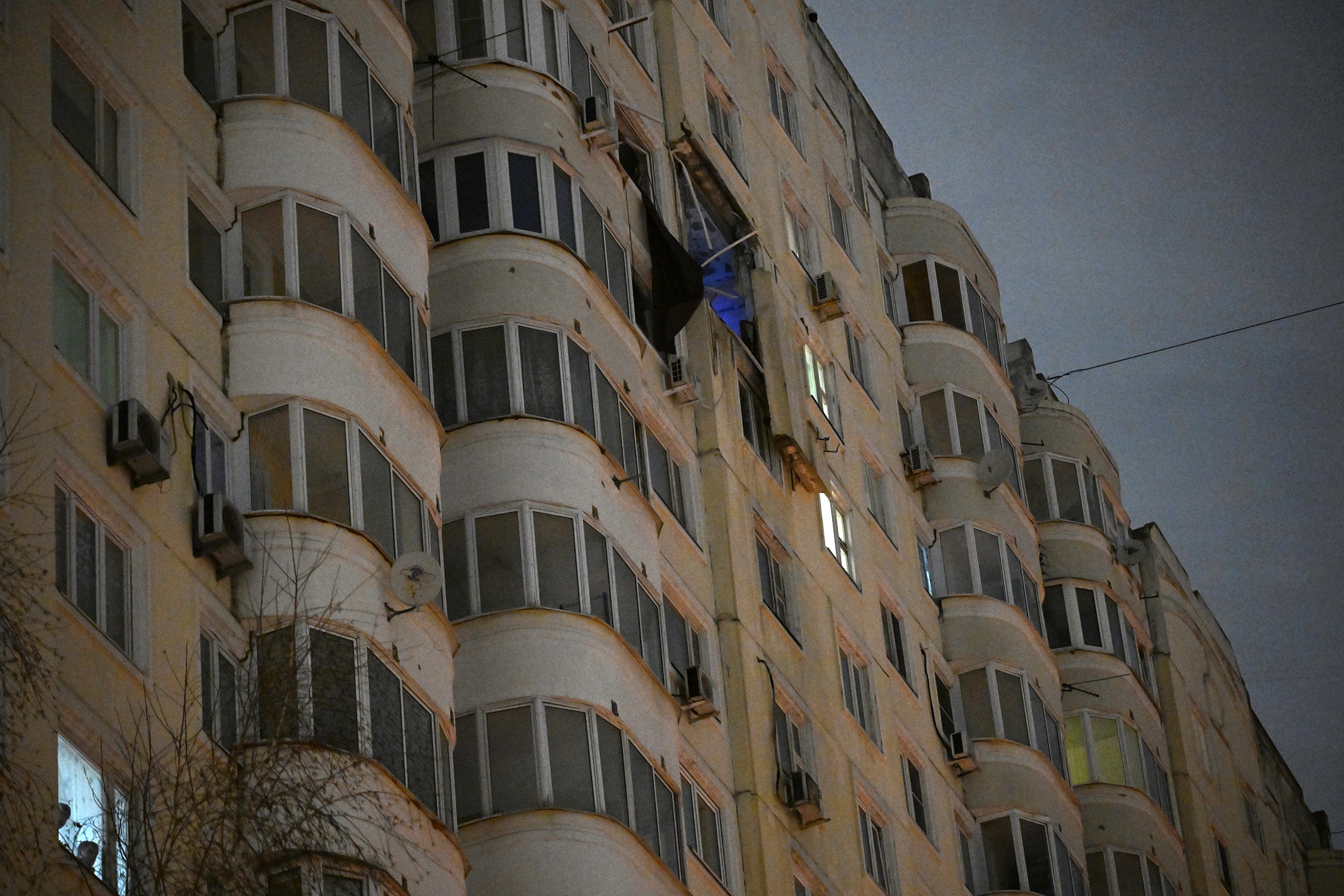 На кадрах видно, что в нескольких окнах взрывом выбило стекла вместе с рамами, а под одним окном висит фрагмент плиты.