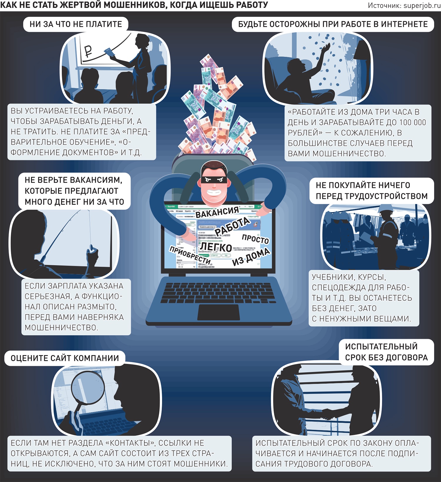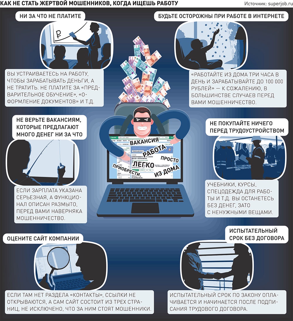 Эксперты добавляют, что риск встретить мошенническую вакансию гораздо ниже на официальных порталах по поиску работы - там работодателей тщательно проверяют. В компании по подбору персонала SuperJob говорят, что проверку работодателя начинают с момента его регистрации: "запрашиваем реквизиты, смотрим сайт, проверяем каждую вакансию, и это не только механическая проверка на так называемые стоп-слова, но и анализ вакансии живым модератором".