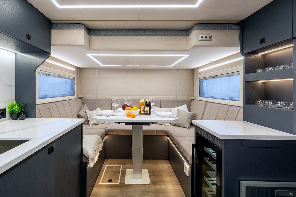 Среди главных особенностей такой машины - внутри есть две изолированные спальные зоны со шторами и двумя комплектами постельного белья. Обеденная зона включает стол и четыре кресла, два из которых поворотные. Кухня оснащена газовой варочной панелью, вытяжкой, мойкой, шкафами и мини-холодильником на 92 литра, газ подается из 27-литрового баллона.