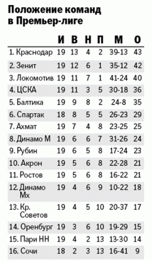 Результаты 19-го тура: "Зенит" - "Балтика" - 1:0, "Оренбург" - "Акрон" - 2:0, "Краснодар" - "Ростов" - 2:1, "Локомотив" - "Пари НН" - 2:1, "Динамо" (Махачкала) - "Рубин" - 2:1, "Динамо" (Москва) - "Крылья Советов" - 4:0, "Ахмат" - ЦСКА - 1:0 . Матч "Сочи" - "Спартак" cостоится 2 марта.