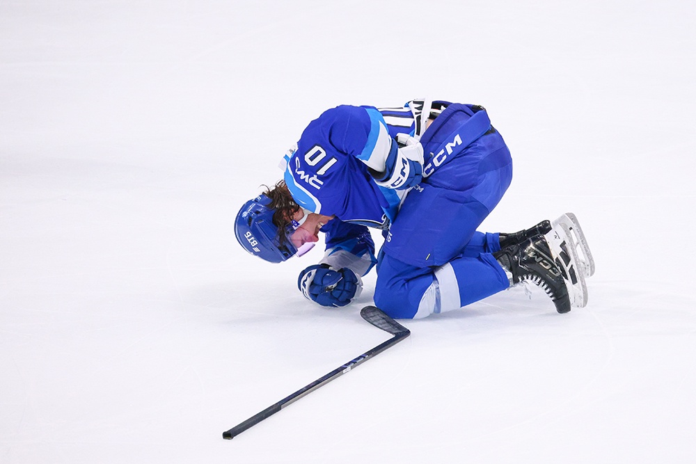 Канадский нападающий "Динамо" после легкого контакта с клюшкой Александра Петунина рухнул на лед, показывая судьям, что соперник сыграл против него грубо, явно требуя от судьи удаления.