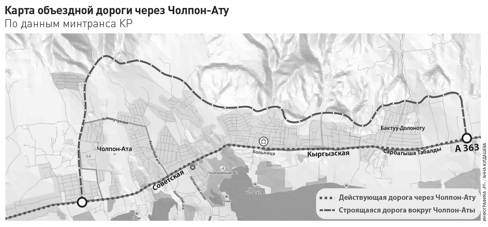 Вопрос о строительстве объездной дороги вокруг Чолпон-Аты назрел давно. Этот город по праву считается заложником ландшафта. Он расположен на относительно узкой полосе между горами и озером. В отдельных местах кварталы ютятся на участках шириной чуть более километра.
