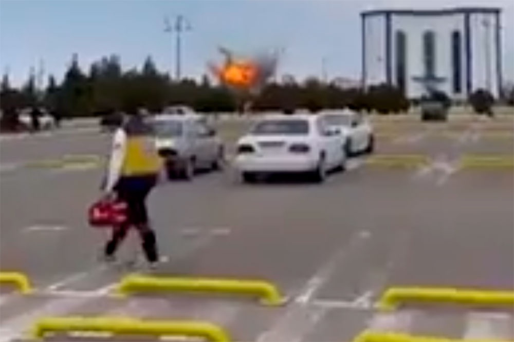 Очевидец ведет съемку с большой уличной парковки перед зданием аэропорта, которое периодически попадает в кадр. На фоне слышен характерный звук приближающегося беспилотника. Спустя несколько секунд происходит мощный взрыв, который видно вдалеке.