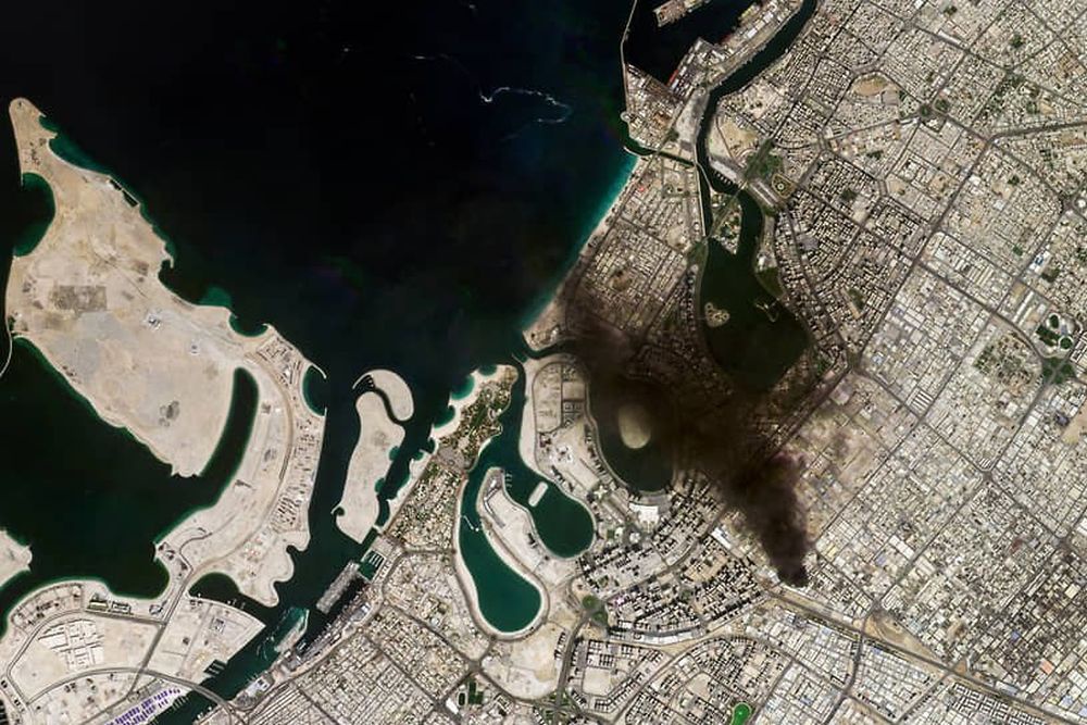 Опубликован спутниковый снимок, где центр города затянут черным дымом масштабного пожара. Черное облако расползлось над городом на километры.