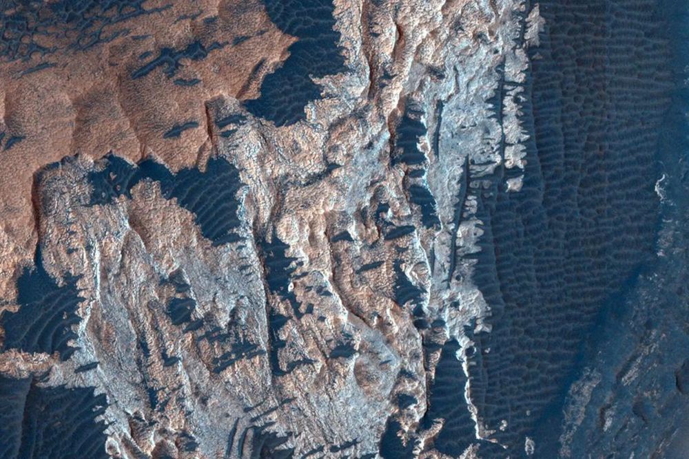 Оба изученных участка хранят следы совсем другого Марса - влажного и, по всей видимости, теплого. Пересохшие каналы, некогда прорезанные потоками воды, соседствуют с небольшой низиной, где, судя по всему, медленно испарялись богатые сульфатами водоемы. По мере того как вода уходила, на дне оседали гидратированные сульфаты железа - из них-то и сформировался прежде неизвестный минерал.