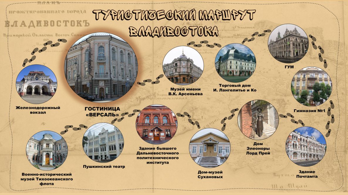 Гостиница находится в нескольких минутах ходьбы от железнодорожного вокзала Владивостока - одной из главных достопримечательностей города. Добраться до "Версаля" можно на общественном транспорте (автобусы № 7, 13, 45, 49, 59, 60, 81, 106, 112, 39Д), на такси или каршерингом. А пешком от вокзала - всего 5-7 минут.