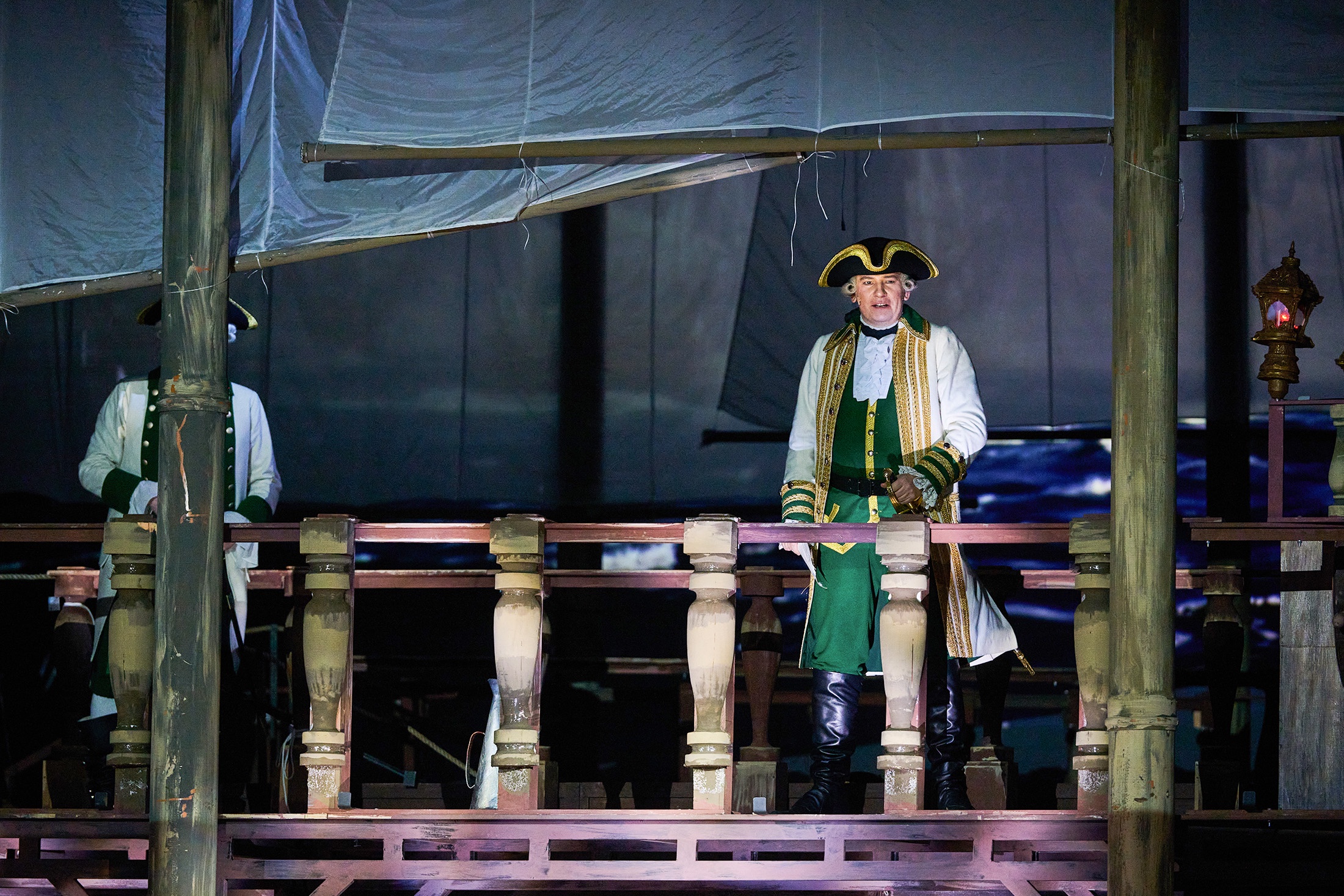 Поворачиваясь обратной стороной борта, корабли превращаются то в учебные классы гардемаринов, то во внутренние каюты, то в избу возлюбленной героя Любушки. Сцены из залов императорских дворцов перетекают на площади восточного базара. Эффектна сцена морского боя, когда в портах действительно показываются бортовые пушки, извергающие огонь. Умело вписаны в пространство между кораблями танцы матросов с виртуозными соло (балетмейстер Иван Фадеев), танцы восточных красавиц на базаре, парадный полонез на балу.