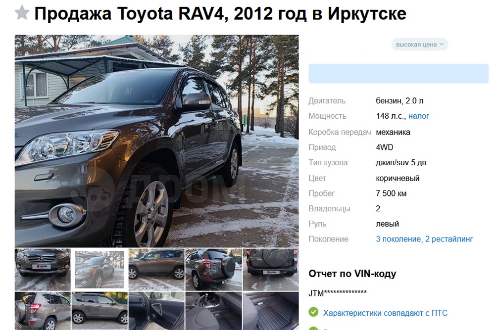 Как выяснила "Российская газета", в Иркутске в продаже появился Toyota RAV4 2012 года выпуска, который проехал всего 7500 км. За свою "капсулу времени" владелец просит 2 650 000 рублей.