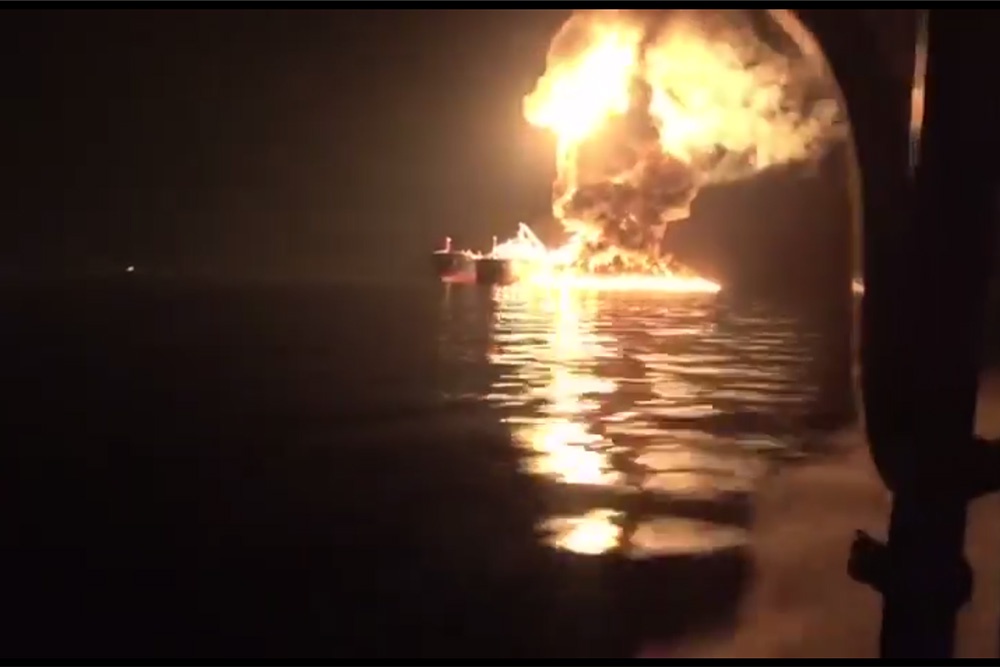 В кадр попал мощнейший взрыв, после чего танкер начал пылать. А иранские военнослужащие с криками "Аллаху акбар" умчались с места атаки. Сообщается, что танкер был атакован северной части Персидского залива после того, как проигнорировал предупреждения от ВМС КСИР. Один из членов экипажа судна погиб.