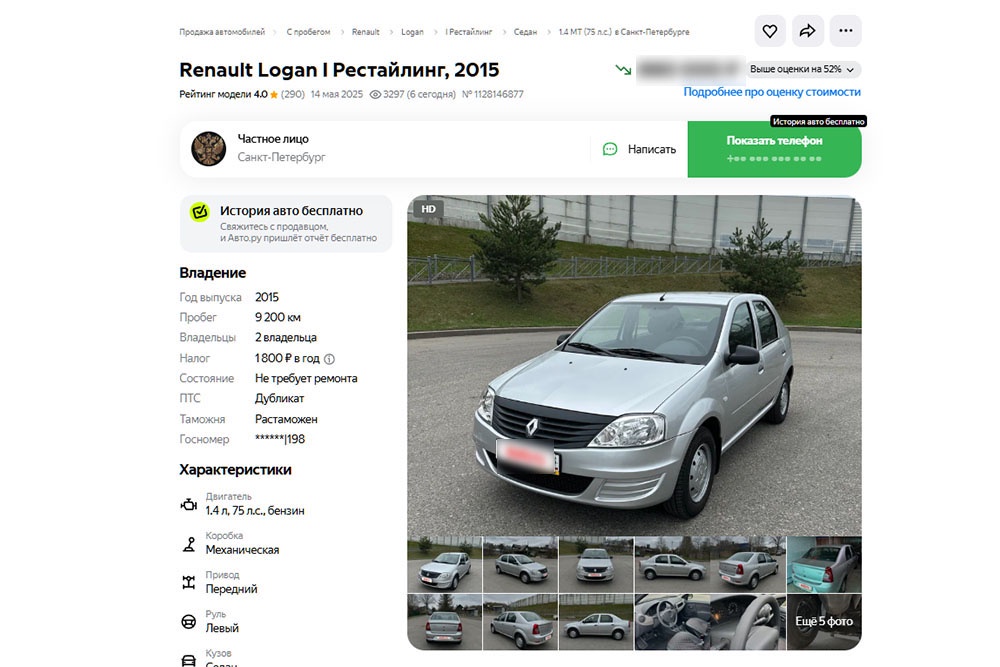 Как выяснила "Российская газета", в Санкт-Петербурге на продажу выставили Renault Logan 2015 года выпуска, который проехал всего 9200 км. Владелец просит за свою "капсулу времени" 990 000 рублей.