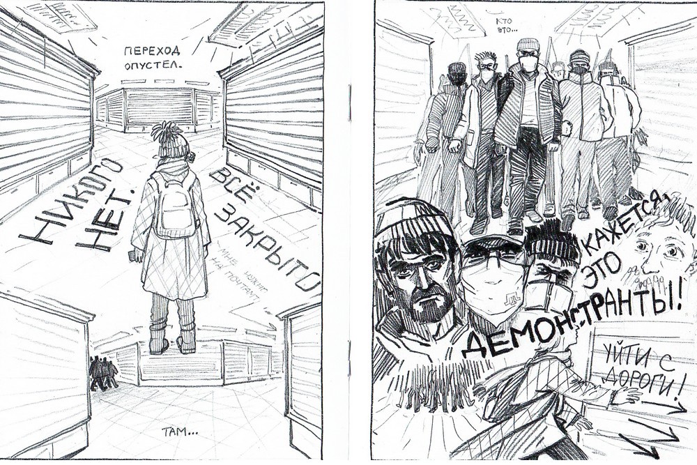 "Каждый из нас запомнил этот день по-своему, я помню ПЕРЕХОД", - написала Вера на титульном листе своей авторской работы. Сюжет она воплотила за три дня и выложила на своей страничке в ВК. А спустя некоторое время напечатала 30 экземпляров самиздатом. В жанре комикса для нее это был дебют, позже она создала еще несколько работ в этой технике и сегодня ведет курсы графического романа в одной из творческих студий. Комикс, считает художница, незаслуженно очернили, посчитав его чем-то легким, несерьезным и неглубоким, априори записав этот жанр в аналы американской массовой поп-культуры.