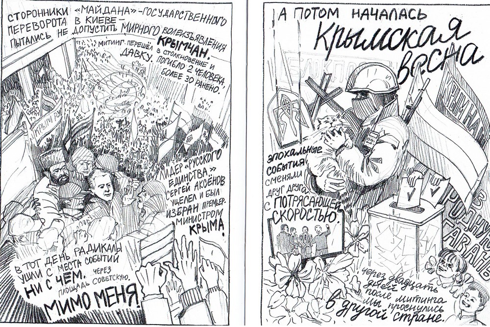 Для своего первого комикса она выбрала один день, вошедший в историю Крымской весны как "великое противостояние" - 26 февраля 2014 года. Эта дата стала самой тревожной в календаре тех весенних событий. Тогда под стенами парламента Крыма столкнулись сторонники запрещенного сегодня в РФ меджлиса и активисты пророссийских организаций. Атмосфера была гнетущая, в давке пострадали 30 человек. Двое погибли. Все, кто не был тогда на площади, прильнули к экранам телевизоров.
